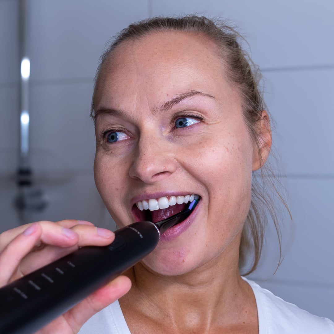 When you brush your teeth, the electric toothbrush vibrates more than 62,000 times, effectively removing plaque from your teeth. The vibrations create a mixture of toothpaste and saliva which, through the force of the movement, reaches the spaces between the teeth where ordinary bristles normally cannot reach.